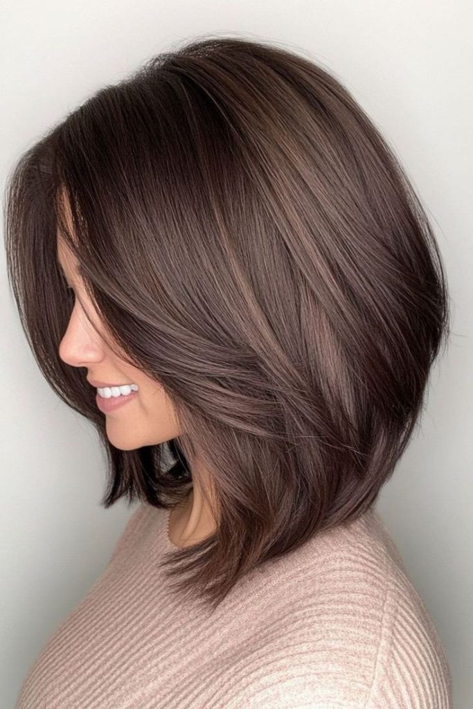 create a polished yet effortless look. The shoulder-grazing length is styled with feathered layers, adding volume and movement while maintaining a sleek and smooth finish. The slightly rounded shape with inward-curved ends enhances fullness around the crown, making the hair appear thicker and more dimensional. Longer front layers sweep naturally toward the face, offering a flattering frame that highlights facial features. Perfect for fine to medium hair, this cut is versatile, easy to style, and carries a modern, elegant vibe that works for both everyday wear and special occasions.